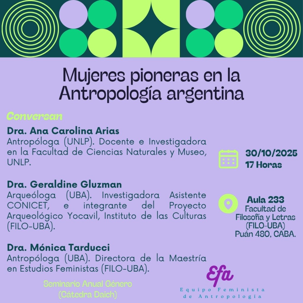 Me complace invitarles al conversatorio «Mujeres pioneras en la Antropología argentina» que es impulsado por el Equipo Feminista de Antropología (EFA), radicado en el Instituto de Investigaciones de Estudios de Género (IIEGe-UBA).