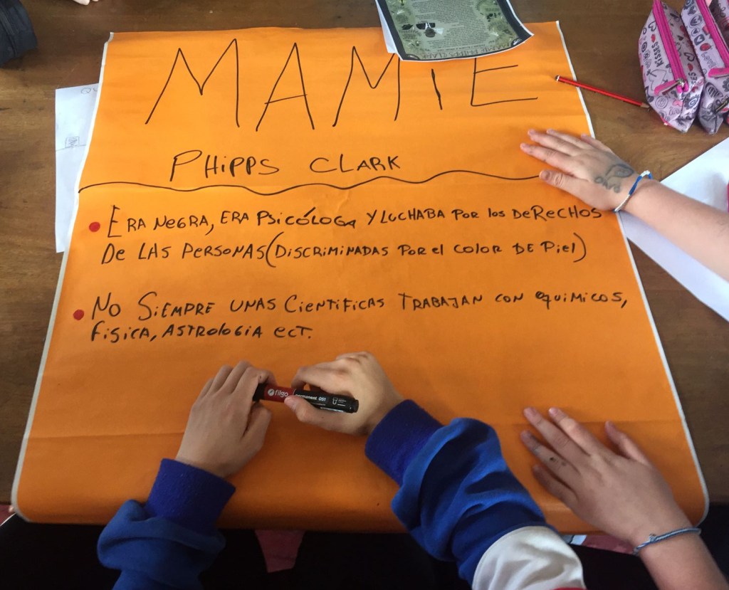Así, Historias inolvidables de científicas intrépidas. Un acercamiento a las mujeres en la ciencia local e internacional se propuso que lxs estudiantes pudieran conocer la diversidad de tareas y profesiones que realizan las mujeres científicas, tanto en el presente como en el pasado. Con lecturas, dibujos y reflexiones en grupo lxs chicxs se sumergieron por un rato en el mundo de las cientìficas. Algunas de las cuestiones que surgieron en los intercambios y en la puesta en común se vincularon con la ruptura de los estereotipos sobre cómo son y a qué se dedican las personas que hacen ciencia: ¡no todxs usan guardapolvos, tubos de ensayo y anteojos! Eso permitió reconocer que hay una gran diversidad de disciplinas, ocupaciones, tareas e intereses que las mujeres han realizado y realizan en la ciencia.
